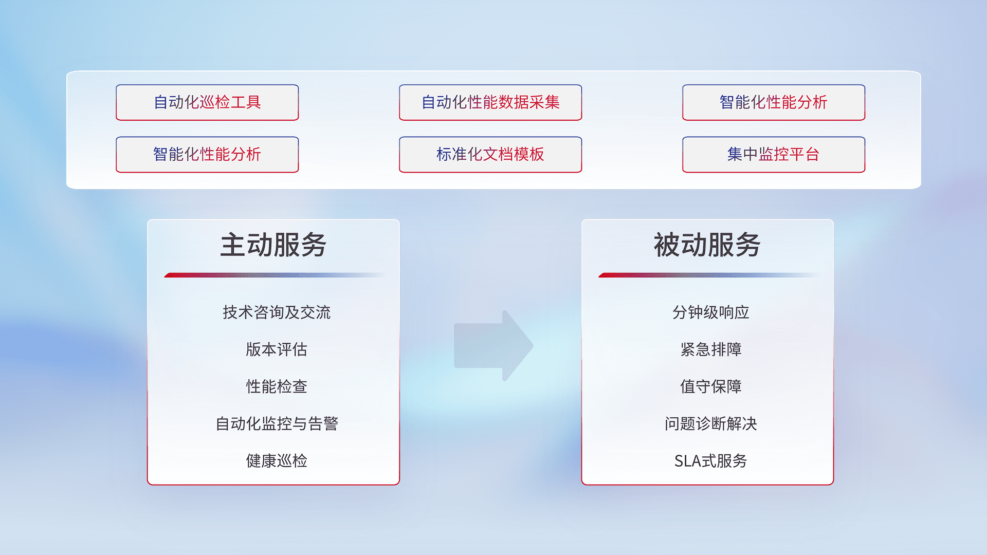 智能化工具和标准化文档,,,保障服务质量,,,,提供主动服务(包含技术咨询、、版本评估、、、性能检查、、、自动化监控与告警、、、、健康巡检)和被动服务包含(分钟级响应、、紧急排障、、、值守保障、、、、问题诊断解决、、、、SLA服务)。。